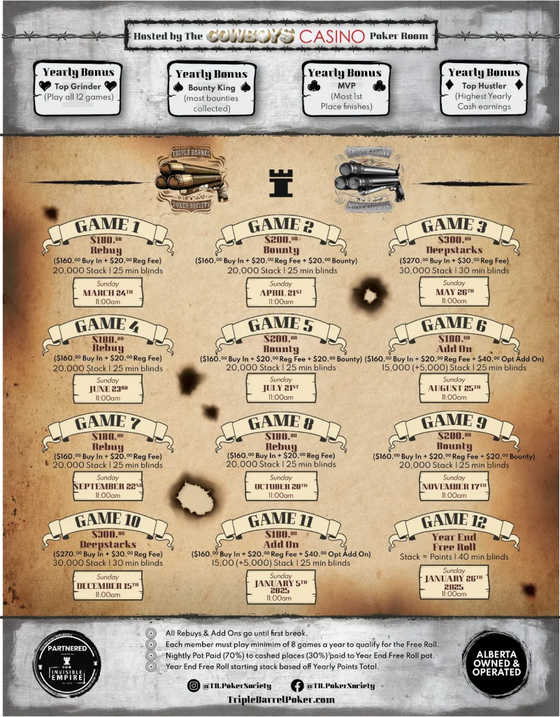 Welcome to Triple Barrel Poker Society – Alberta’s premier poker league. Created by players for players, we offer top-tier games, secure payouts, and a transparent leaderboard. Partnering with Cowboys Casino, we’re expanding Alberta’s poker scene with bigger prizes and unmatched experiences.