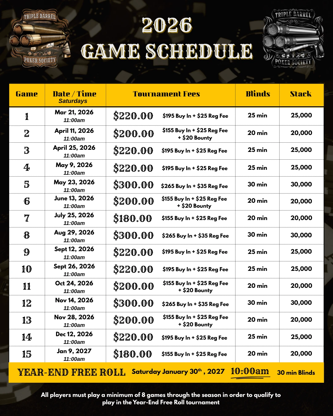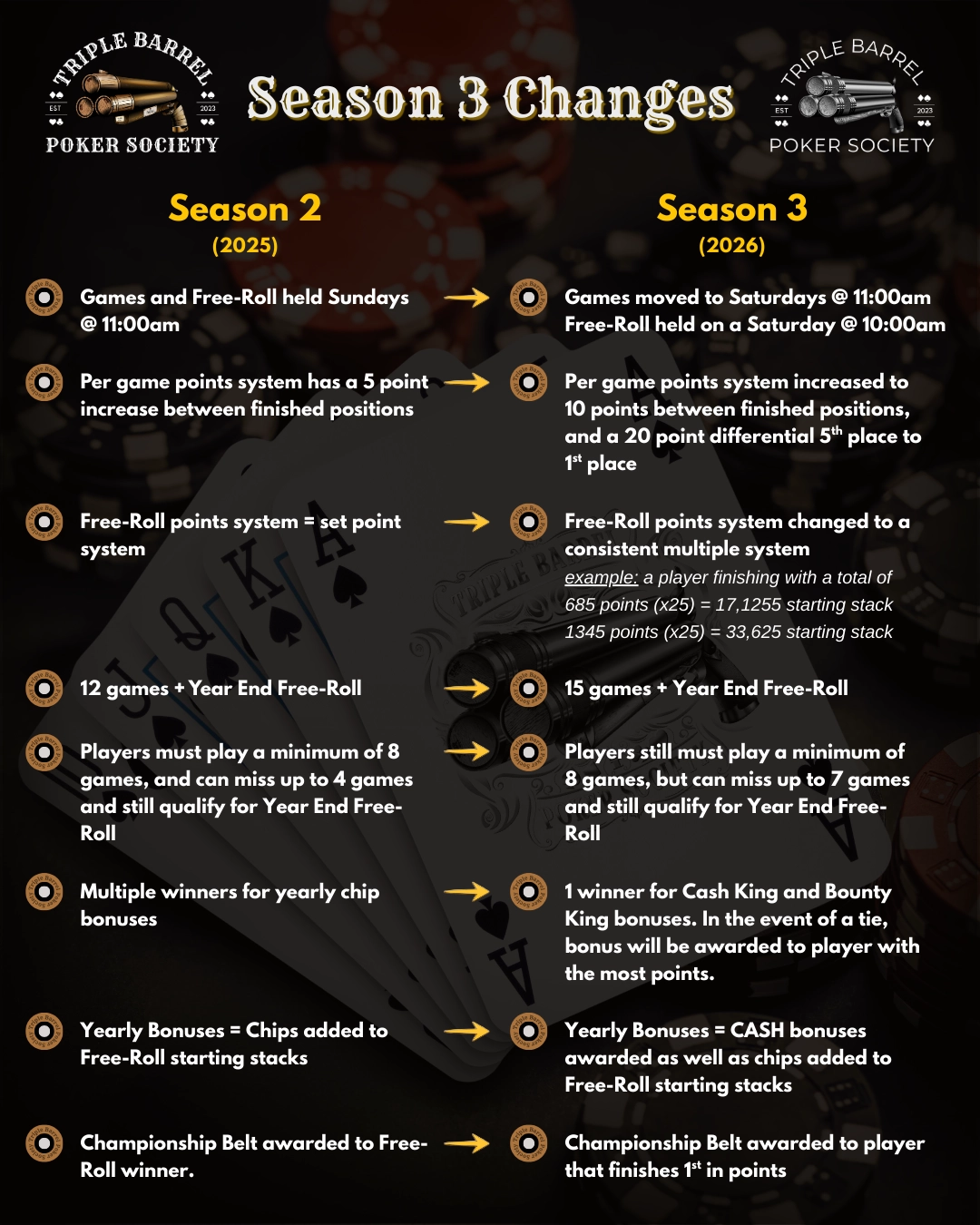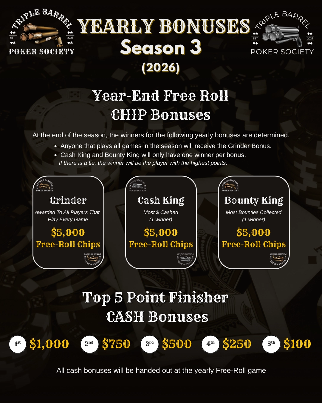 Season 3 marks the next evolution of Triple Barrel Poker Society. With an expanded schedule, updated league structure, and a continued focus on rewarding consistent play, this season is shaping up to be the most competitive yet. As the league grows, so does the scale of the game—setting the stage for an even bigger Year-End Free Roll and another strong chapter for Triple Barrel.