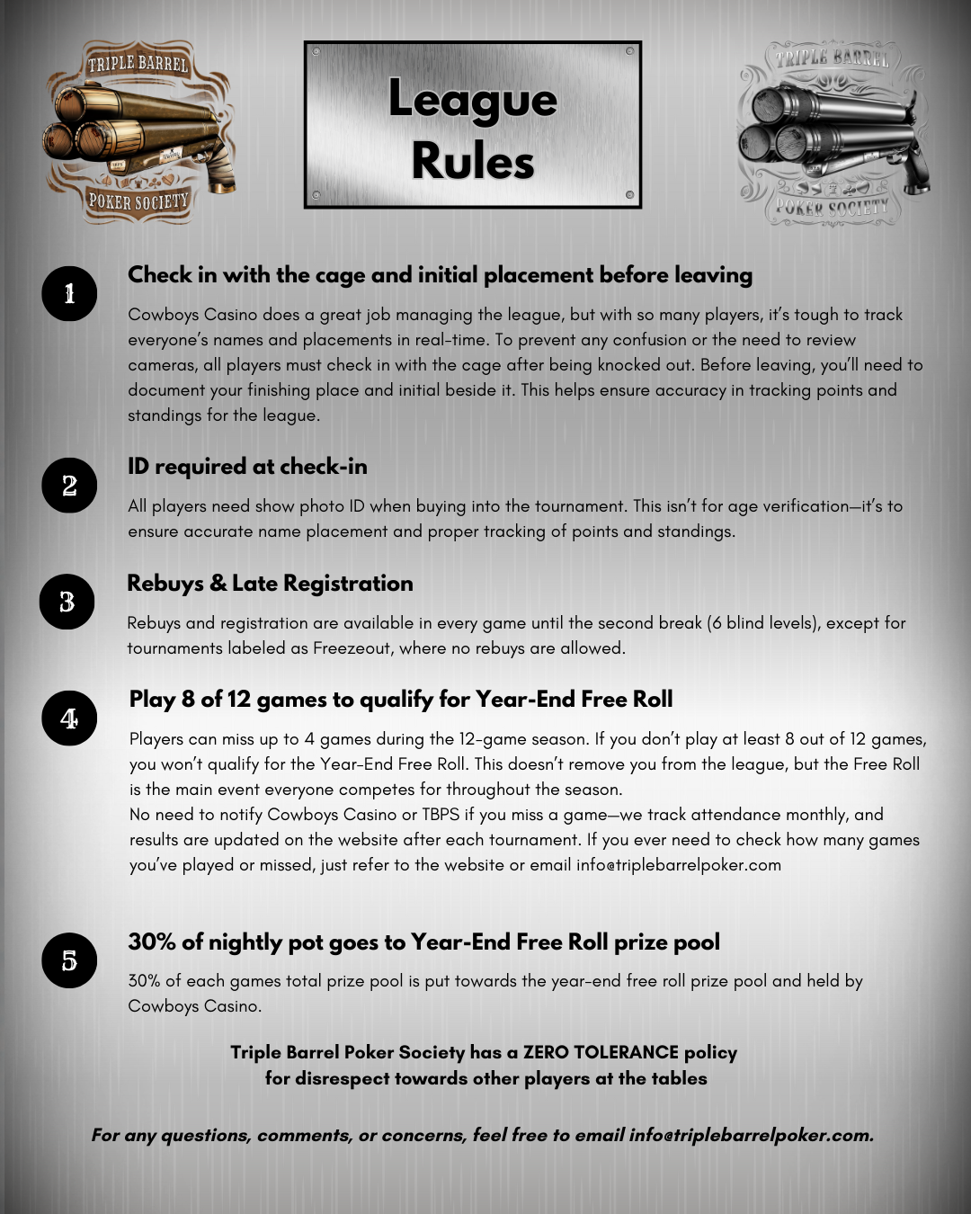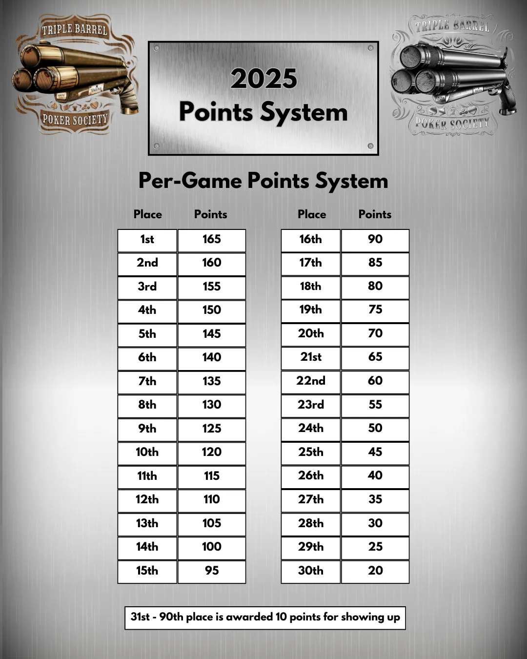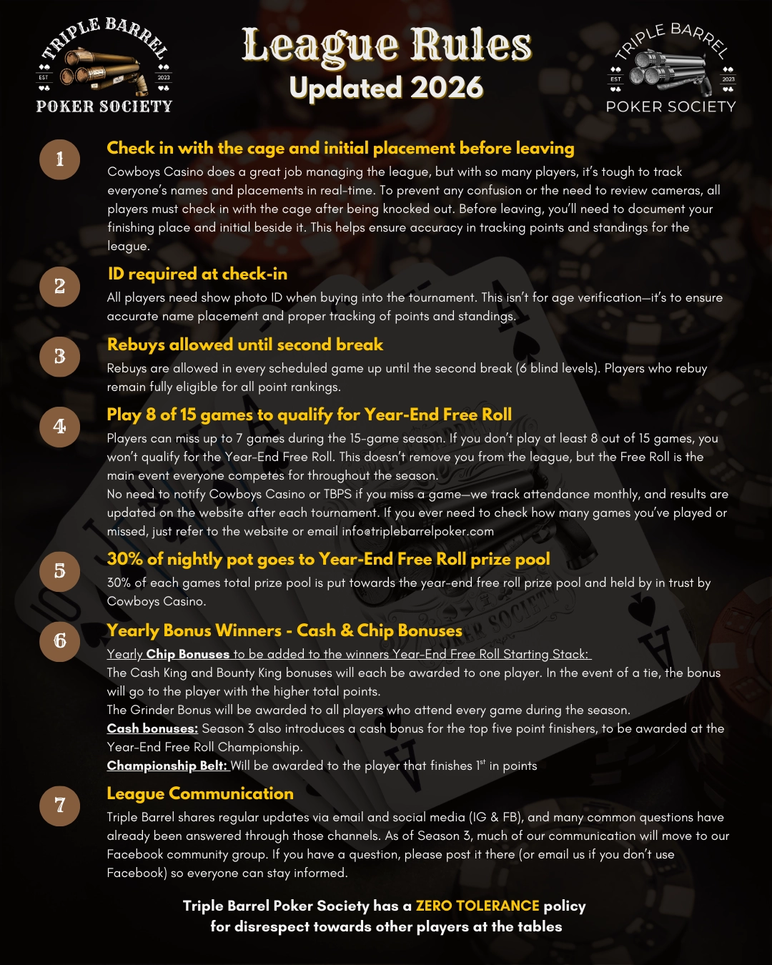 Season 3 marks the next evolution of Triple Barrel Poker Society. With an expanded schedule, updated league structure, and a continued focus on rewarding consistent play, this season is shaping up to be the most competitive yet. As the league grows, so does the scale of the game—setting the stage for an even bigger Year-End Free Roll and another strong chapter for Triple Barrel.