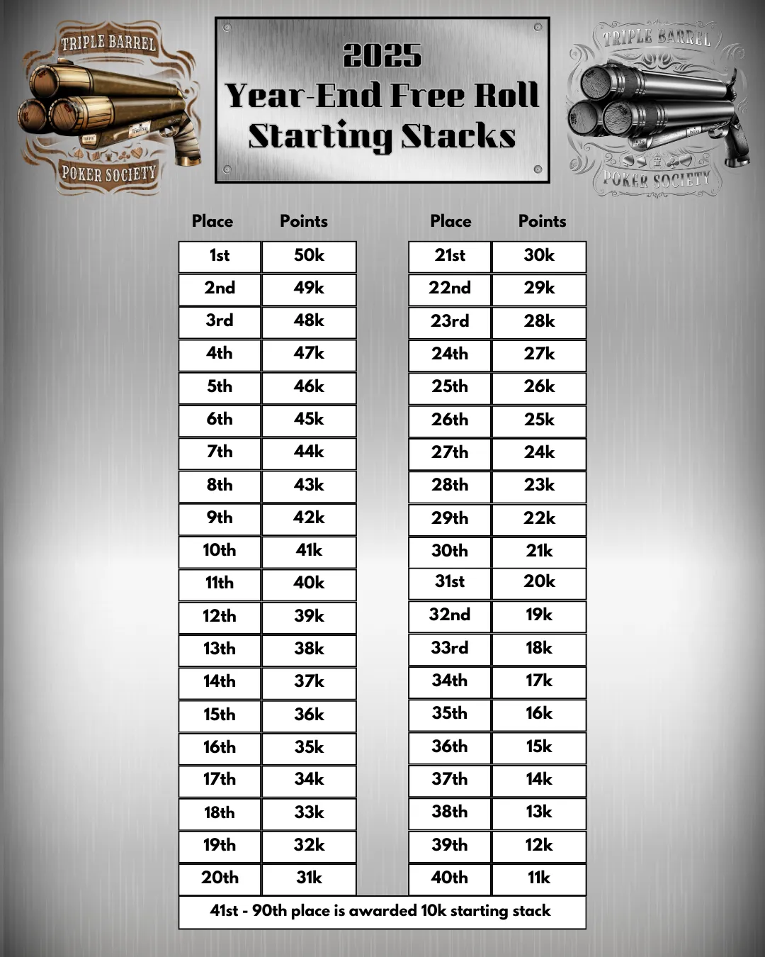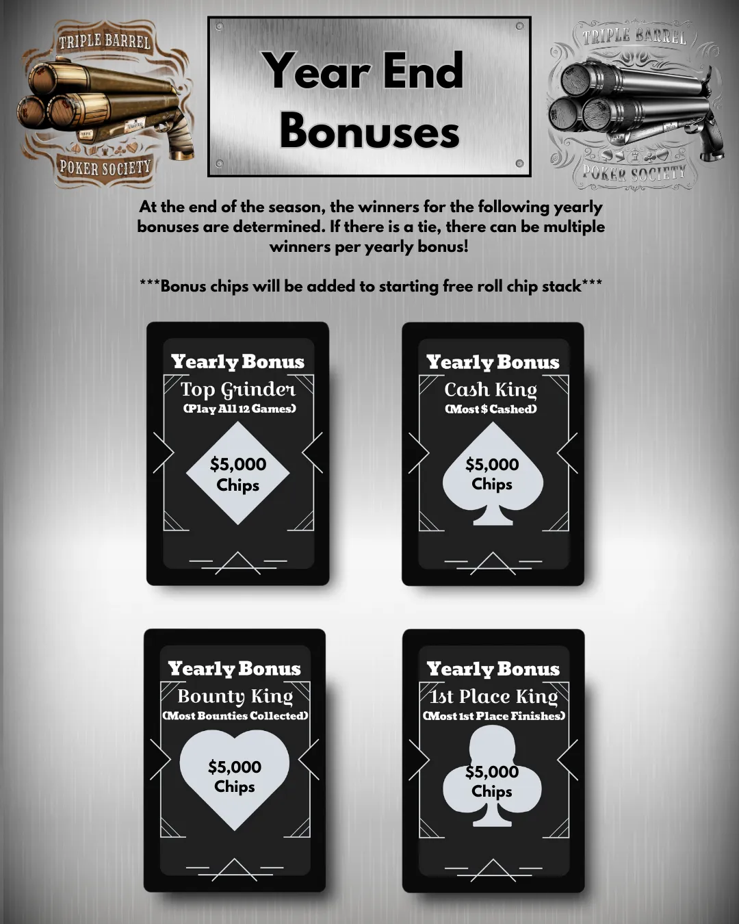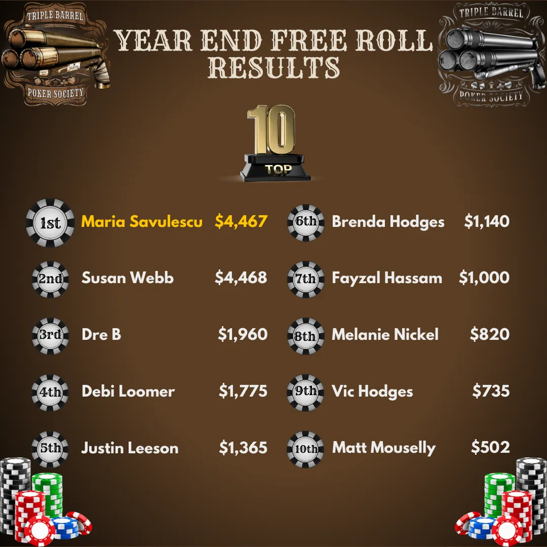 Season 2 marked a major step forward for Triple Barrel Poker Society. The league continued to grow, competition became tighter, and consistent participation throughout the season helped push the Year-End Free Roll prize pool to $25,149. With larger fields, deeper runs, and a stronger overall pace of play, Season 2 showed just how far the league had come since its first year.